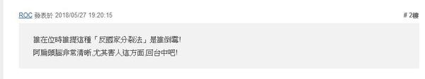 还有网友则向蔡英文提醒了,“阿扁又不甘寂寞了,自己不敢做的事,现在要菜小阴(英)出来顶缸?”并表示“谁在位时谁提这种启动《反分裂国家法》条件之一的言行,谁就会倒霉”,如果真要这样做,“就离统一不远了”。