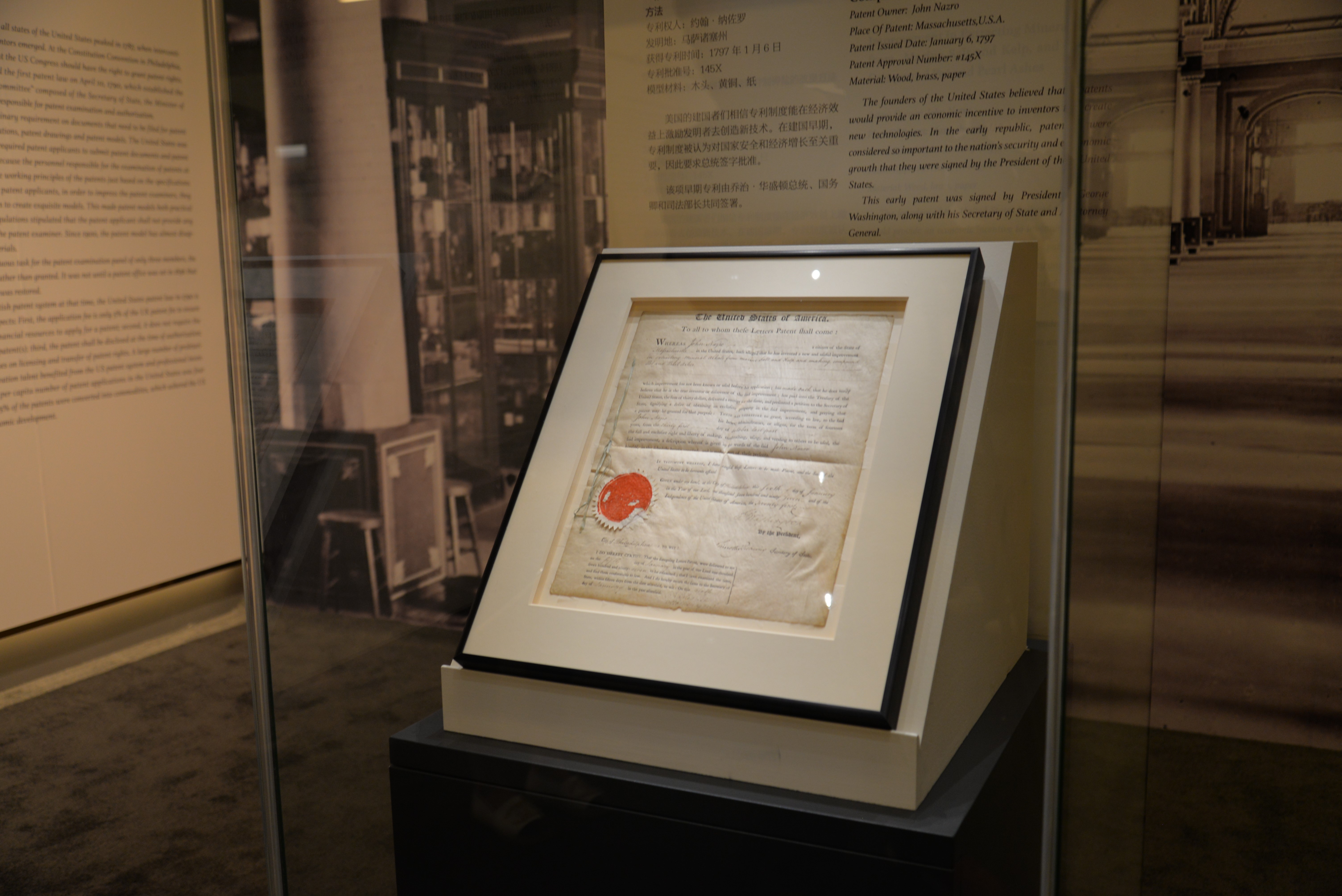 本次展览的60余件19世纪美国专利模型均为哈格利博物馆与图书馆馆藏,包括发动机、交通运输、采掘工业、印刷业、轻工业、衣食住行6个部分,较为全面地展示了19世纪美国在各领域的技术发展和发明创造。与此同时,展览还展出了一份1797年由乔治·华盛顿总统签署的美国专利证书,这份珍贵文件相当程度上展示了美国在建国初期对专利制度的探索和重视。