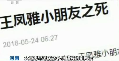 央视网消息:去年11月,河南农村三岁女孩王凤雅被确诊患上了一种罕见病。她的家庭选择网络募捐平台向社会求助,但从今年3月起,就有人在网络上不断爆料,说她的父母将善款提现后,并没有用于救治王凤雅。5月初,小凤雅去世了,这本来是一起悲剧,但是关于小凤雅没有得到相应救治的声音仍在网络发酵,一时间,各种质疑、指责、甚至谩骂,扑向了这个家庭。
