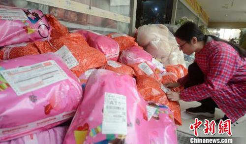 图为商家工作人员为包裹贴上快递单?!∶系铝∩?nbsp;