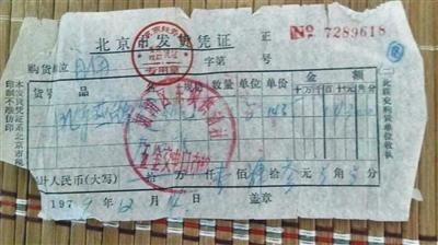 到了上世纪70年代末,韩先生的家里买了一台老式的燕牌缝纫机,至今还留存着当时的购票凭证。这份购票凭证上,写明这台缝纫机是在1979年12月14日购买,价格为143元,盖上了朝阳区东坝供销社和北京税务的两个章。