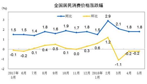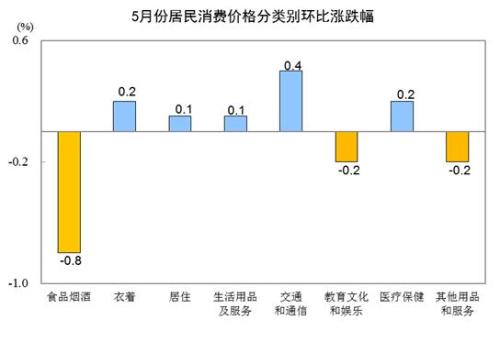 5月份,全国居民消费价格环比下降0.2%。其中,城市下降0.2%,农村下降0.1%;食品价格下降1.3%,非食品价格上涨0.1%;消费品价格下降0.2%,服务价格下降0.1%。
