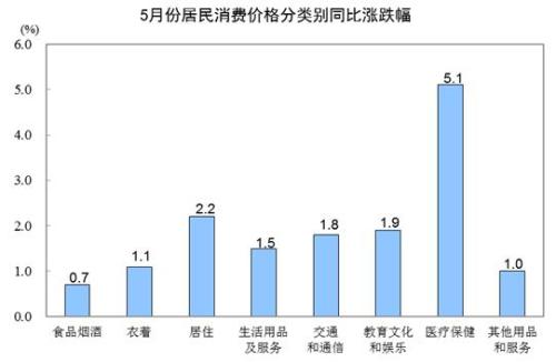 其他七大类价格同比均上涨。其中,医疗保健、居住、教育文化和娱乐价格分别上涨5.1%、2.2%和1.9%,交通和通信、生活用品及服务价格分别上涨1.8%和1.5%,衣着、其他用品和服务价格分别上涨1.1%和1.0%。