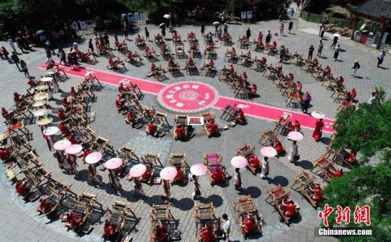 资料图:6月7日,近百名土家织锦工人走进世界自然遗产地湖南张家界武陵源。中新社发 吴勇兵 摄