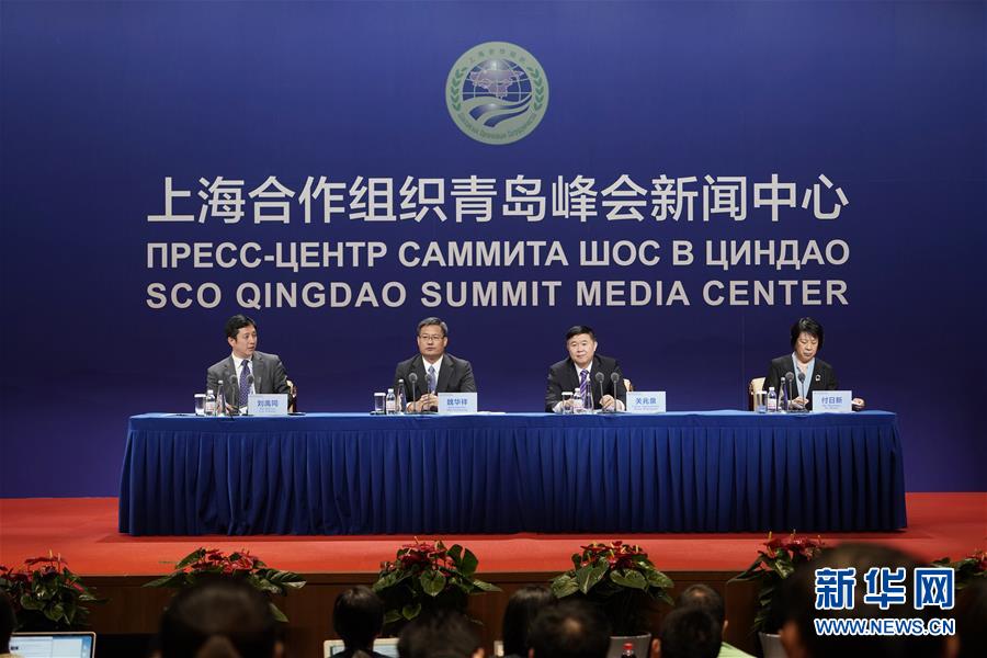 6月8日,山东省政府副秘书长、新闻发言人魏华祥(左二)在上海合作组织青岛峰会新闻中心举行的新闻发布会上说,“一带一路”沿线国家和上合组织成员国已成为山东外贸进出口的重要增长点,山东将以上合组织青岛峰会为契机,加快构建国际开放大通道。新华社记者邢广利摄