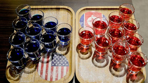 还有用威士忌酒调制出的蓝色“特朗普”鸡尾酒,和用烧酒调制出的红色“金”鸡尾酒。