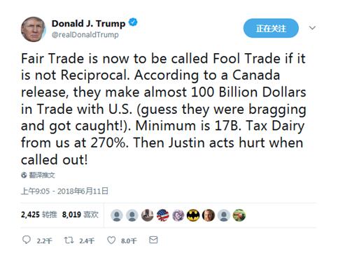 此前9日,加拿大总理特鲁多在G7峰会上发表联合公报称将共同致力于打击贸易保护主义,并在新闻发布会上称美国征税行为是在羞辱加拿大,并称“加拿大人彬彬有礼,通情达理,但我们也不会被人摆布”。