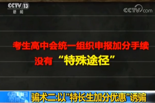 骗子称能办理艺术、体育、小语种等各类“特长生”加分,甚至冒充高校招办工作人员,设立小语种、艺术类提前招生考试现场。在此提醒,考生高中会统一组织申报加分手续,没有“特殊途径”。