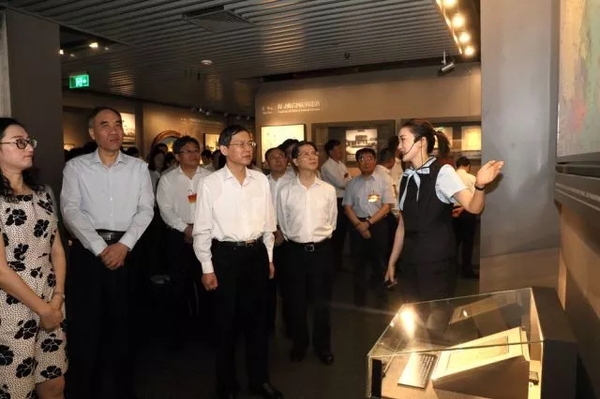 随后,郝明金一行参观了《伟大开端——中国共产党创建历史陈列》?!扒案昂蠹獭⒕韧鐾即妗?、“风云际会、相约建党”、“群英汇聚、开天辟地”等专题展区,陈列着大量实物和图片,根据历史资料制作的雕塑和缩微景观还原了历史场景。郝明金凝神静听,不时询问细节。