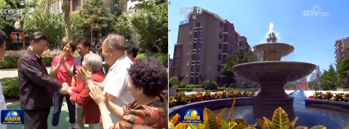 习近平察看社区整体环境和居民居住情况时,走到正在健身休闲的居民身边,同大家握手,向大家问好。他询问部分居民年龄后,微笑着说,“这些都是我的大哥大姐了”,并称赞大家身体都很硬朗,称赞环境非常好。