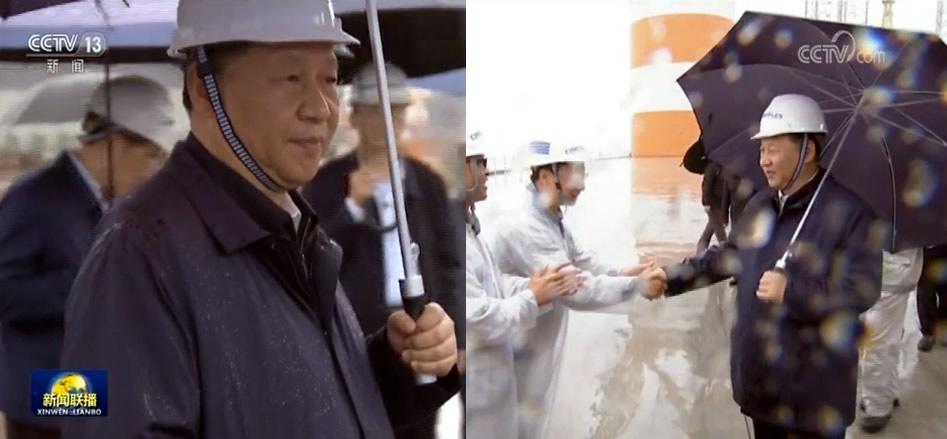 在厂区码头,习近平撑着雨伞,趟着积水,近看、远眺各种平台,详细了解高端海洋工程设备制造、维护、运行情况。海风吹起了衣襟,雨水打湿了衣服。习近平站在雨中,用左手执伞,用右手同围拢过来的工人们一一握手,向作业平台上的工人们挥手致意,衣袖早已被雨浸湿贴在手臂上,但他仍然面带微笑,不为所动。