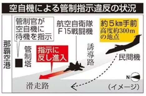 但空自的两架F-15战斗机未理会空管人员的指示,在晚上8点25分左右,依次从诱导道进入了那霸机场的跑道??展苋嗽狈⑾终庖磺榭龊?,为避免发生严重事故,立即要求两架F-15战斗机离开跑道,同时取消了民用客机的着陆许可。在确认F-15战斗机离开跑道后,空管人员再次批准了民用客机的着陆许可,约2分钟后,这架民用客机在跑道上成功着陆。