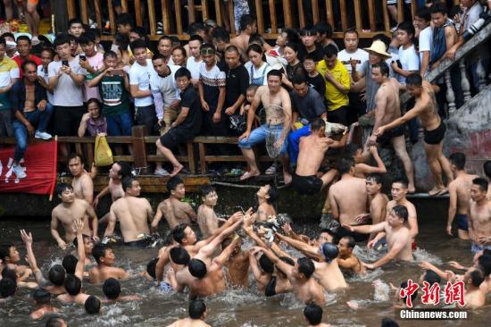 众人跳入河中围抢一只鸭子。 杨华峰 摄