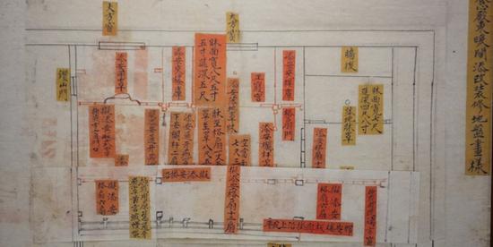 《养心殿东暖阁添改装修地盘图样》反映的是室内假仙楼的改造过程。该图样由墨线朱线绘制,有黄、红色贴签数枚,应为内檐装修改造设计进呈样。图样中反映的改造内容集中在东暖阁后室,最大的变化就是取消了到西侧的楼梯,布局仿东侧寝宫设计。同时取消了居中放置的两张宝座床,改为后檐炕。
