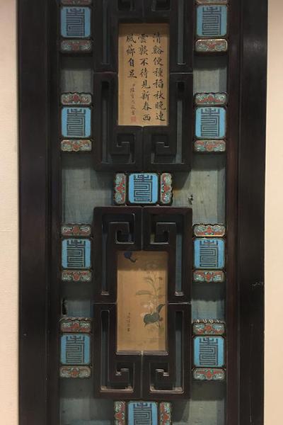 乐寿堂嵌珐琅书画屉心槅扇,包括槅心紫檀回纹灯笼框,卡子花镶嵌蝙蝠夹寿字纹珐琅,槅心双屉夹蓝纱,槅眼双面贴落臣工书画。