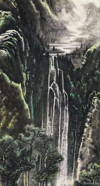 画家重拾北宋范宽《溪山行旅图》为代表之“丰碑式山水”构图。这幅山水画杰作,基本意象就是两组:一组是“崇山茂林,葱郁华滋”;一组是“奔流急湍,如鸣管弦”。一为山,二为水,单纯的不能再单纯,甚至连房舍、桥亭和点景人物都省略了。色彩也很单纯,水墨之上,局部轻染淡墨,略分深浅,以表达“葱郁华滋”的生气;除了树干和局部山石轮廓用浓墨,全画基本上是用淡墨一层一层积墨而成,画出了“草木蒙笼其上”的感觉;山谷远处,“若云兴霞蔚”,水气蒸腾。一左一右两组瀑布,如银练飞流直下,在山崖上跳荡出俊俏的身段;及至谷底,又于溪涧巨石间穿梭奔跃,白水黑石,组合成好看的图样。十几株大树,亭亭玉立,树冠交织出曼妙的舞姿,似在风中稷稷有声,和鸣那奔流急湍带来的急管繁弦!