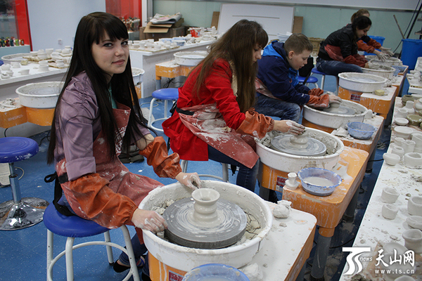 来自俄罗斯伊斯基季姆友城的学生在克拉玛依市青少年活动中心体验陶艺制作。