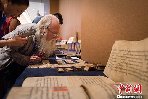 6月16日,一位外国专家观看记载象雄文化的古籍。中新社记者 何蓬磊 摄