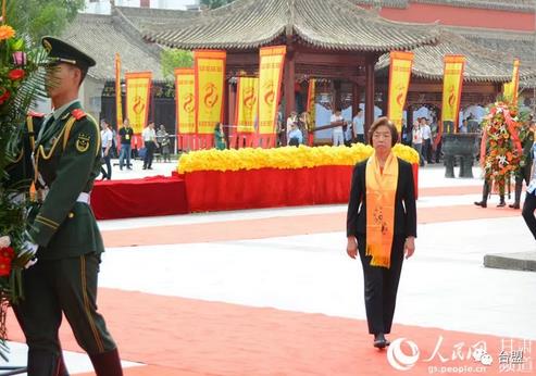 乐舞止歇,苏辉、吴伯雄及夫人戴美玉、唐仁健、欧阳坚、孙伟等缓步来到伏羲庙中院的先天殿,敬献花篮,行鞠躬礼,瞻仰伏羲圣像。