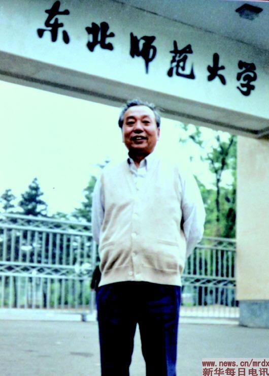 郑德荣在东北师范大学校门前留念(1985年6月21日摄)。新华社发