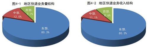 上半年,东、中、西部地区快递业务量比重分别为80.3%、12%和7.7%,业务收入比重分别为80.3%、11.1%和8.6%。与去年同期相比,东部地区快递业务量比重下降0.7个百分点, 快递业务收入比重下降0.8个百分点;中部地区快递业务量比重上升0.3个百分点, 快递业务收入比重上升0.3个百分点;西部地区快递业务量比重上升0.4个百分点,快递业务收入比重上升0.5个百分点。