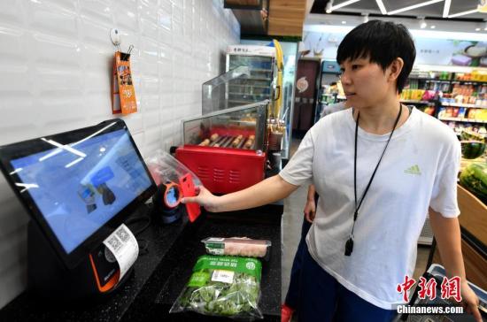 女子在福州一家无人超市内购物并用支付宝自助结账。 吕明 摄