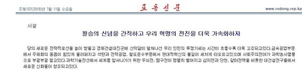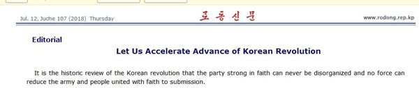 7月11日,朝鲜《劳动新闻》头版刊发题为《带着必胜的信念,让我们加速朝鲜革命的前进》的社评。第二天,《劳动新闻》官网刊登了这篇社评的英文版。