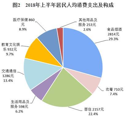 上半年,全国居民人均食品烟酒消费支出2814元,增长5.1%,占人均消费支出的比重为29.3%;人均衣着消费支出710元,增长6.3%,占人均消费支出的比重为7.4%;人均居住消费支出2157元,增长12.4%,占人均消费支出的比重为22.4%;人均生活用品及服务消费支出598元,增长11.8%,占人均消费支出的比重为6.2%;人均交通通信消费支出1286元,增长6.2%,占人均消费支出的比重为13.4%;人均教育文化娱乐消费支出932元,增长7.2%,占人均消费支出的比重为9.7%;人均医疗保健消费支出860元,增长19.7%,占人均消费支出的比重为8.9%;人均其他用品及服务消费支出253元,增长7.1%,占人均消费支出的比重为2.6%。