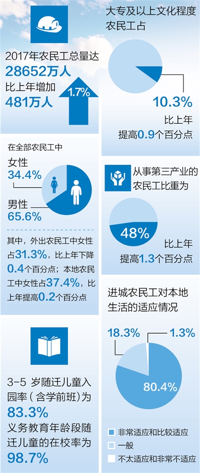 国家统计局日前发布的《2017年农民工监测调查报告》显示,2017年我国农民工总量达到28652万人。随着新生代农民工成为群体中的大多数,他们的学历、收入、技术水平和生活环境都在逐步提升。农民工群体出现了哪些新特征?他们的职业选择和发展有什么新变化?