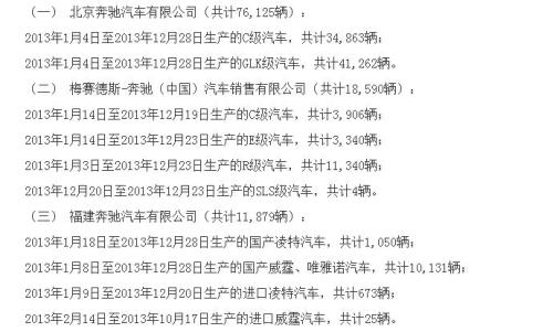 中新网客户端7月18日电 (记者 吴涛)18日,国家市场监督管理总局发布消息称,北京奔驰、梅赛德斯-奔驰(中国)、福建奔驰因配件供应原因,决定自2019年4月30日起召回2013年生产的部分车辆,共计106594辆。这些车辆在空气囊展开时,气体发生器可能发生异常破损,导致碎片飞出,伤及车内人员,存在安全隐患。拥有奔驰的你,“中招”了吗?