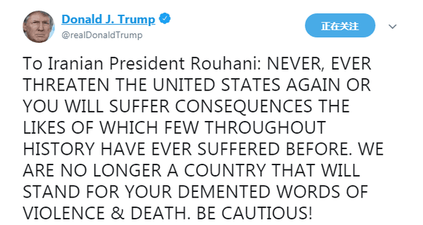 特朗普警告伊朗总统:永远不要再威胁美国!小心点!
