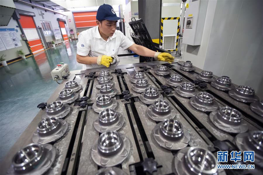 在万向钱潮智慧工厂,一名工人在上毛坯(7月4日摄)。小到牙刷、电池,大到汽车、轮船、大飞机……改革开放40年,中国制造坚持开拓,苦练内功,在与世界贸易伙伴携手共进中,逐渐融入全球贸易体系。新华社记者 沈伯韩 摄