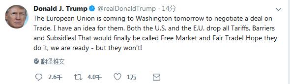 特朗普在推文中称,“欧盟明天将前往华盛顿商讨贸易协议。我有个主张,美国和欧盟同时取消所有关税、壁垒以及补贴。那样最终会被视为自由市场和公平贸易!希望他们能做到,我们是已经做好了准备——但他们不会。”