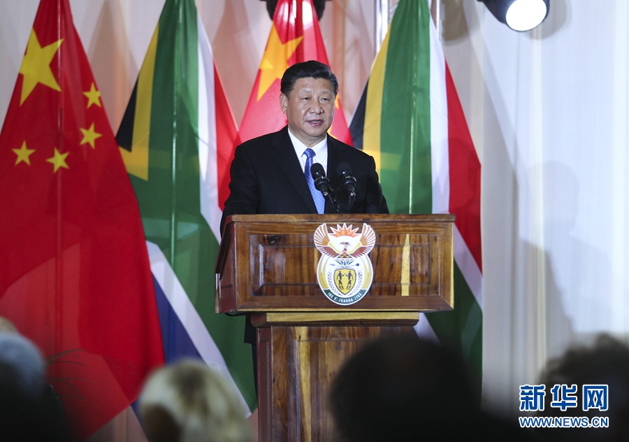 7月24日,国家主席习近平在比勒陀利亚出席南非总统拉马福萨举行的欢迎习近平主席对南非进行国事访问暨庆祝中南建交20周年晚宴。这是习近平发表致辞。新华社记者 谢环驰 摄