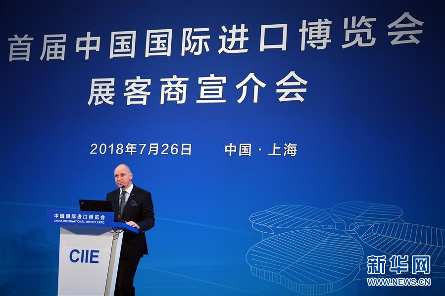 7月26日,法国乐斯福集团大中华区总裁浦建菲在首届中国国际进口博览会展客商宣介会上介绍企业产品。新华社记者 金良快 摄