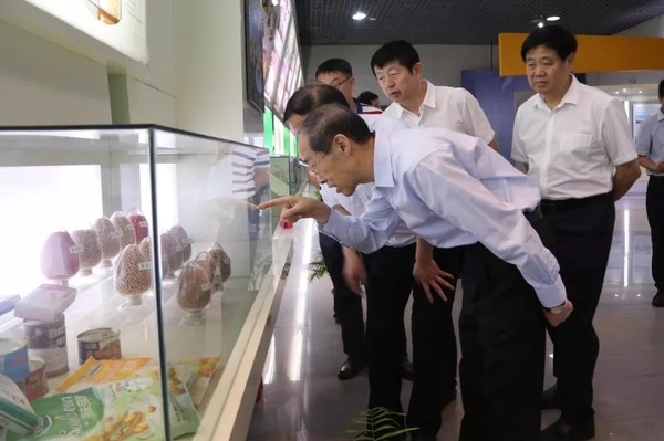 8月1日上午,民革中央调研组一行在北大荒博物馆调研。万鄂湘十分关心农业科研情况。图为万鄂湘仔细观察展示的农作物种子。