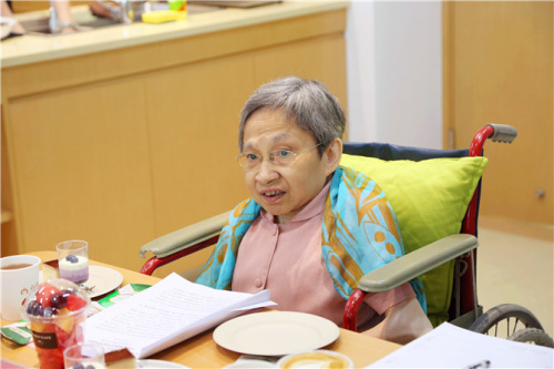 “参加这个会议,我感到非常荣幸。1952年,我从印尼回到祖国,那年我11岁,我妹妹9岁。1959年父亲患癌去世前,郑重向我母亲嘱咐,不管有什么困难,不能再回到印尼,一定要相信党,相信政府,把我们的根留住。后来,我慢慢体会到这份情感从何而来。我身体不好,每年各级侨联组织领导都会上门看望我和妹妹,街道社区也给予了我无微不至的关爱,这么多年从未间断,真的要感谢我们的侨联?!笨到〗值拦榍惹染齑砑颓骞鹚?。