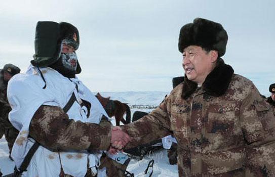 2014年1月26日,习近平来到祖国边疆的内蒙古阿尔山,冒着零下30多度的严寒慰问在边防线上巡逻执勤的官兵。来源:新华社