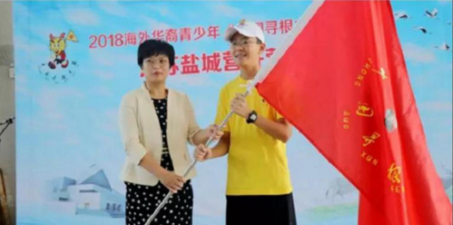 开营仪式上,江苏省侨办李红处长、盐城市外侨办董玲玲主任分别为盐中夏令营营员代表圣地亚哥华夏中文学校乐恩、市一中营员代表美国菁英学院张浩扬授旗,标志着2018海外华裔青少年“中国寻根之旅夏令营·江苏盐城营”正式开营。随后来自盐城中学和市一中的志愿者,为大家表演节目以示欢迎。