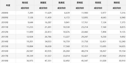 经济日报-中国经济网记者查询易居研究院智库中心提供的厦门新建商品住宅各区的价格走势图发现,近十年来厦门房价一路上涨,以年度成交均价维度来看,厦门岛内二区思明区和湖里区,均价从2008年的1万多元上涨至2018年(前7月)的4.7万元左右,岛外海沧区、集美区、同安区、翔安区从十年前的六七千元上涨至如今的三万元左右。