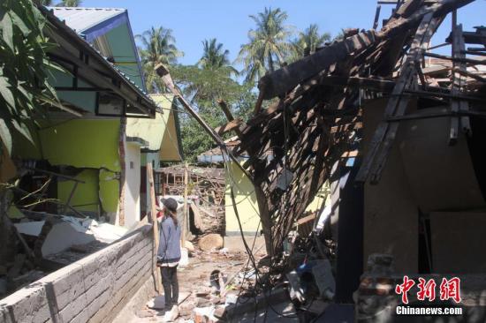 印尼龙目岛7级地震导致数千栋房屋损毁严重。图为8月7日,位于该岛Senggigi 海滩附近Senggigi村的损毁房屋。该村数百座房屋损毁,全村断水断电,村民在村子空地上分散安置。 中新社记者 林永传 摄