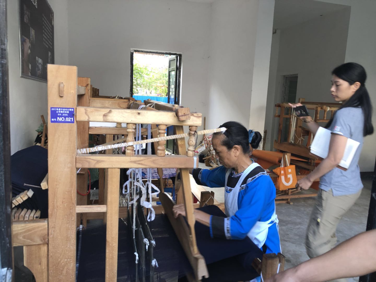 布依族妇女廖应萍在车间纺线织布。动作娴熟的她,一只梭子在织布机上来回穿梭。“我们以前在深山里编织土布都是用来给自己做衣服,现在是给企业织布,每天固定有一百元左右的工资哩?!?017年6月,原住在大山深处的廖应萍在政府引导下搬迁进了土布小镇,凭借织布手艺,织布成为廖应萍一天上班的工作内容,也给家里带来了稳定的收入。今年30岁的王小面前几年在浙江务工,每个月工资3500元左右,2017年搬迁到者相镇以后,她选择留在土布工匠坊上班当一名打样工人,每个月的工资维持了一家人的生活。