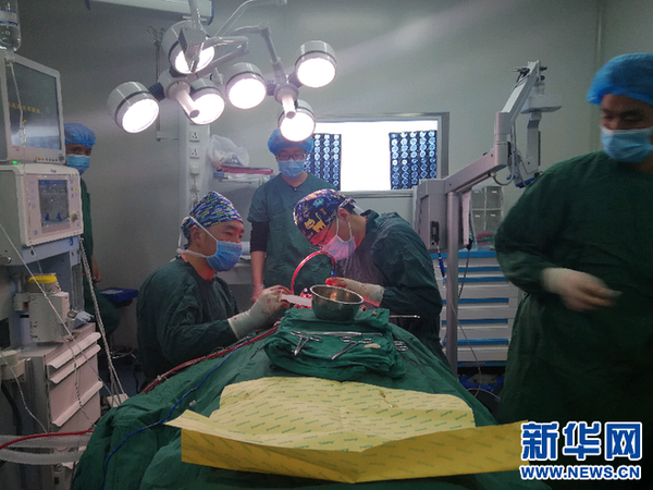 援藏与那曲本地医生正在合作进行手术(2017年11月24日摄)。新华社发(辽宁省第三批组团式援藏医疗队提供)