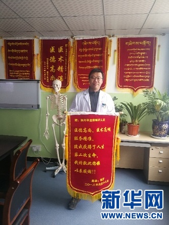 援藏医生班允超收到患者赠送的锦旗(2018年6月19日摄)。新华社发(辽宁省第三批组团式援藏医疗队提供)
