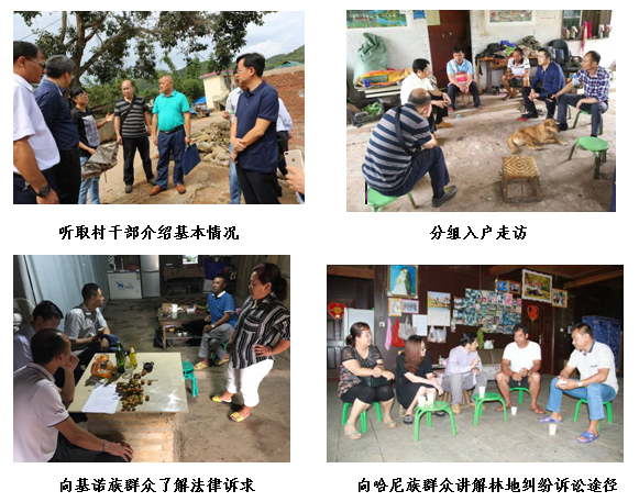 为深入了解基层群众的法律诉求,切实走进最需要法律帮助的老百姓当中,服务团成员辗转数百公里,深入景洪市基诺族乡巴亚村、嘎洒镇沙药村等少数民族村寨,踏上田间地头,走进村民家中,与当地乡村干部、贫困户代表、驻村扶贫工作队员座谈了解,挨家挨户促膝长谈,听取、整理了20余起涉法涉诉问题的反映和诉求,运用多年的办案经验和丰厚的法律知识面对面地为群众一一解答,引导大家运用法律的有力武器合理进行维权活动。对于农民普遍关注的土地征收、林权纠纷、婚姻财产等法律问题,服务团在积极宣传法律常识的同时,结合具体情况为村民提出解决问题的指导性意见建议,并指定律师与村民互留联系方式,进行“一对一”公益法律帮扶,确保群众在后续的依法维权当中有专业律师挂钩指导,避免群众在脱贫致富、全面奔小康的路上因为法律问题而走弯路、走错路等现象的发生。