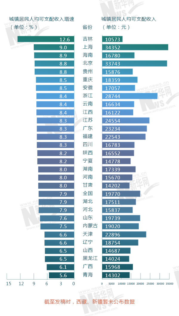 吉林、上海和海南以12.6%、9%、8.9%的增速,排在今年上半年各省份城镇居民人均可支配收入增速榜前列。而收入数额最高的省份是上海、北京和浙江。