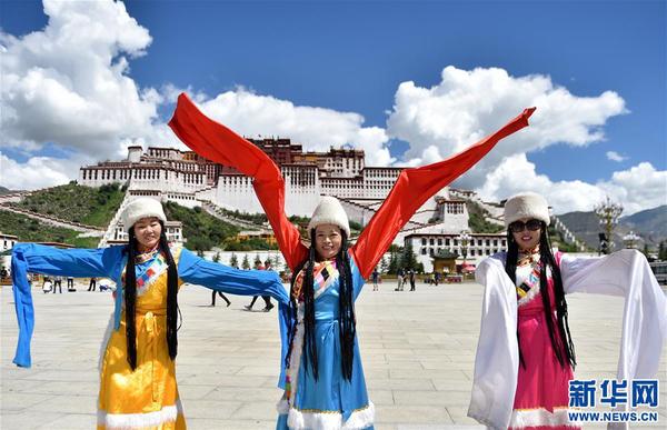 8月8日,游客穿着藏族服饰在布达拉宫广场留影。新华社记者 觉果 摄
