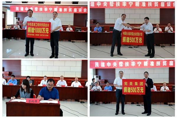 座谈会上还举行了捐赠和签约仪式。中华思源工程扶贫基金会为丰宁县捐赠1000万元款物,中国社会福利基金会授渔计划为丰宁县捐赠500万元,完美(中国)有限公司为丰宁县捐赠500万元,京东集团与丰宁元始农业种植有限公司签订合作意向。