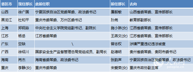 2018年,山西、黑龙江、上海、江苏、广东、广西、海南、重庆调整省级党委统战部部长职务。