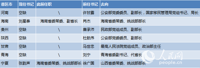 2018年,河南、海南、贵州、陕西、甘肃、青海、宁夏调整省级党委政法委书记,目前,河南、贵州、陕西、甘肃、青海的政法委书记职务空缺待补。